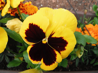 But that's not all. Inspiration is blooming all over the yard. This year, in a move totally unrelated to knitting (Scout's honor!!) I chose a big mess o' pansies for flowering annuals. Here they are in all their midsummer glory. Remind you of anything?